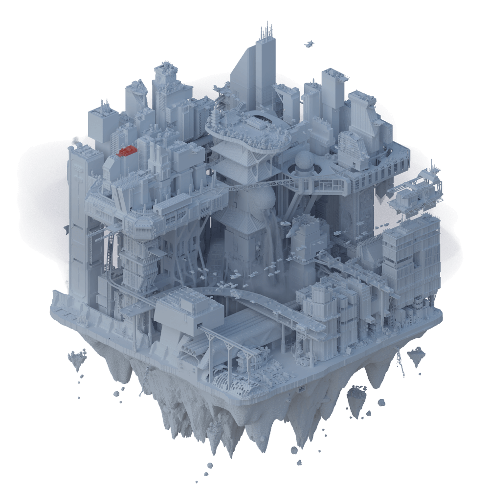Radiating a sense of tradition that is felt immediately after exiting the landing pad, this large two-story Minka-style house is the Toshima family's villa on the skyline. Flanked on either side by dense bamboo gardens and groves of colorful bushes, the entranceway to the house is engulfed with a soothing natural energy, where small stone pathways crisscross the grounds leading to hidden shrines and pagodas. Standing atop the second-story balcony that faces the entrance, the Toshima matriarch, Keiko, casts a watchful eye over the three generations of her family scattered across her vast grounds. Born into an aristocratic family, she was the sole founder of Toshima Enterprises, one of the most successful real estate development companies in NeoTokyo. She now spends her time proudly watching over the estate and the opportunities she has been able to provide to her family, which will live on for many generations to come. Elsewhere in an outdoor sparring arena, two of the youngest grandchildren are engaged in a kendo duel as their fathers sit on the sidelines coaching them. Located underneath a wise black sakura tree that has seen generations of the Toshima family duel, kendo is a tradition steeped in the family's heritage, evidenced by the samurai armor watching on in the corner.