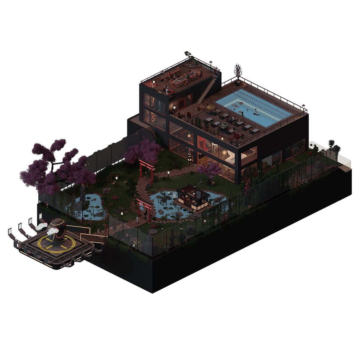 Sato Villa, the home of Kazu Sato, who is standing dressed in an all-white suit under the torii gate at the entrance of his estate with his family, where they are greeting the incoming cohort NeoTokyo's ultra-wealthy. A group interconnected by generations of marriages, business partnerships, and high-profile friendships, they frequently meet at the Sato Villa to discuss business ventures and socialize, and today is no different. Upon the rooftop dining area, a feast has ended, and some guests have wandered off to explore the rest of the house, namely the arcade room and the swimming pool. The living room sits unused, as does the tea pavilion in the outside garden, as the crowd remains congregated on the roof. Reflected in the conference room on the ground floor, a holographic display depicts a mountain range that the family has recently acquired. As the topic of their gathering today, they are meeting to discuss plans for the residential complex they are planning to build, where they are accompanied by holographic projections of partners who aren't able to attend in person.