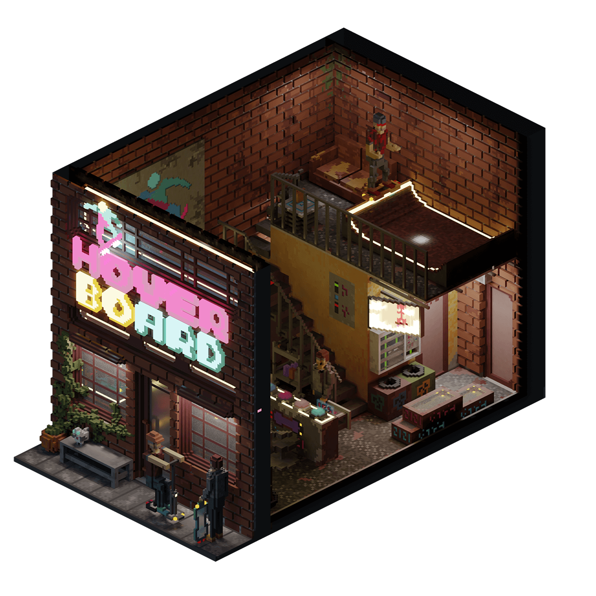 An old brickworks factory that has since been converted into a hoverboard shop and has become a popular space for creatives and those involved in NeoTokyo's skate scene. The shop pays homage to its roots by preserving the original brick walls.