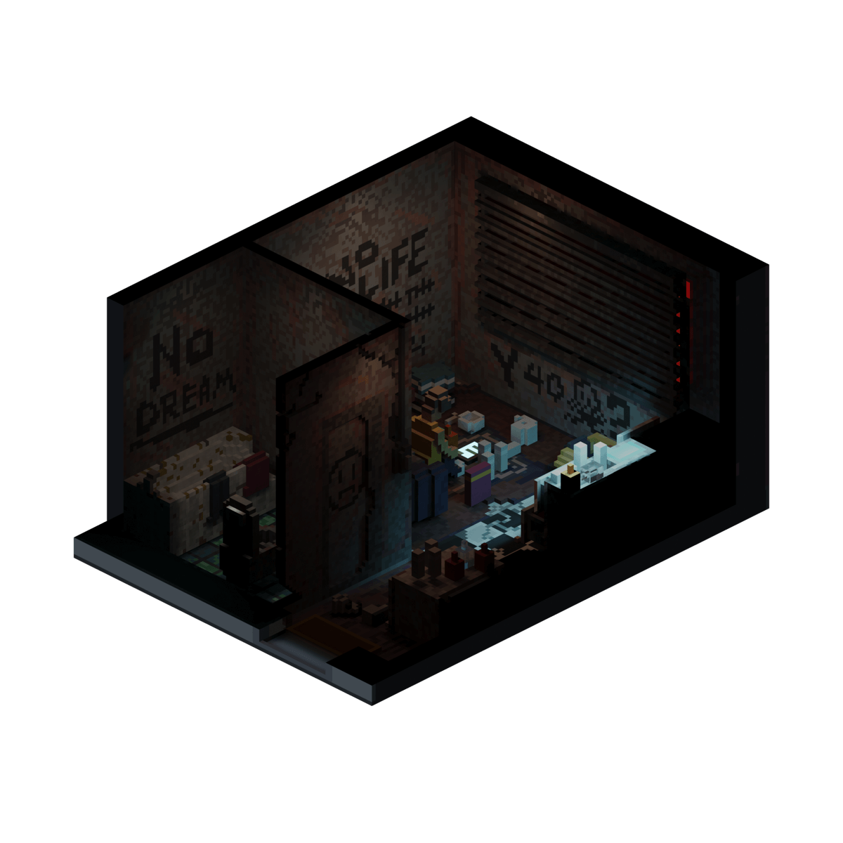 The dark and messy studio apartment of a reclusive man who, depressed with his life in the lower classes of the City, tallies the days that have passed since he last left his house on his wall. Due to having his blinds permanently shut, this is his only measure of time.