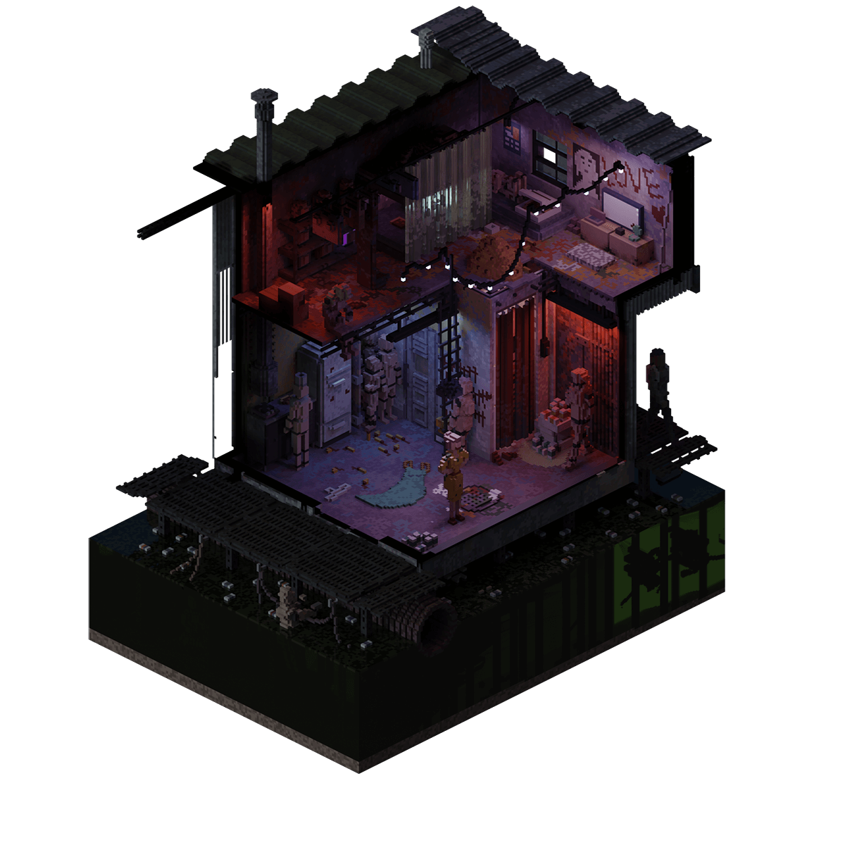 A vandalized shack littered with mannequins, the only audience of a once famous model who, after an incident at one of her shows, has plummetted down the ranks of NeoTokyo and into a life of poverty and neglect.