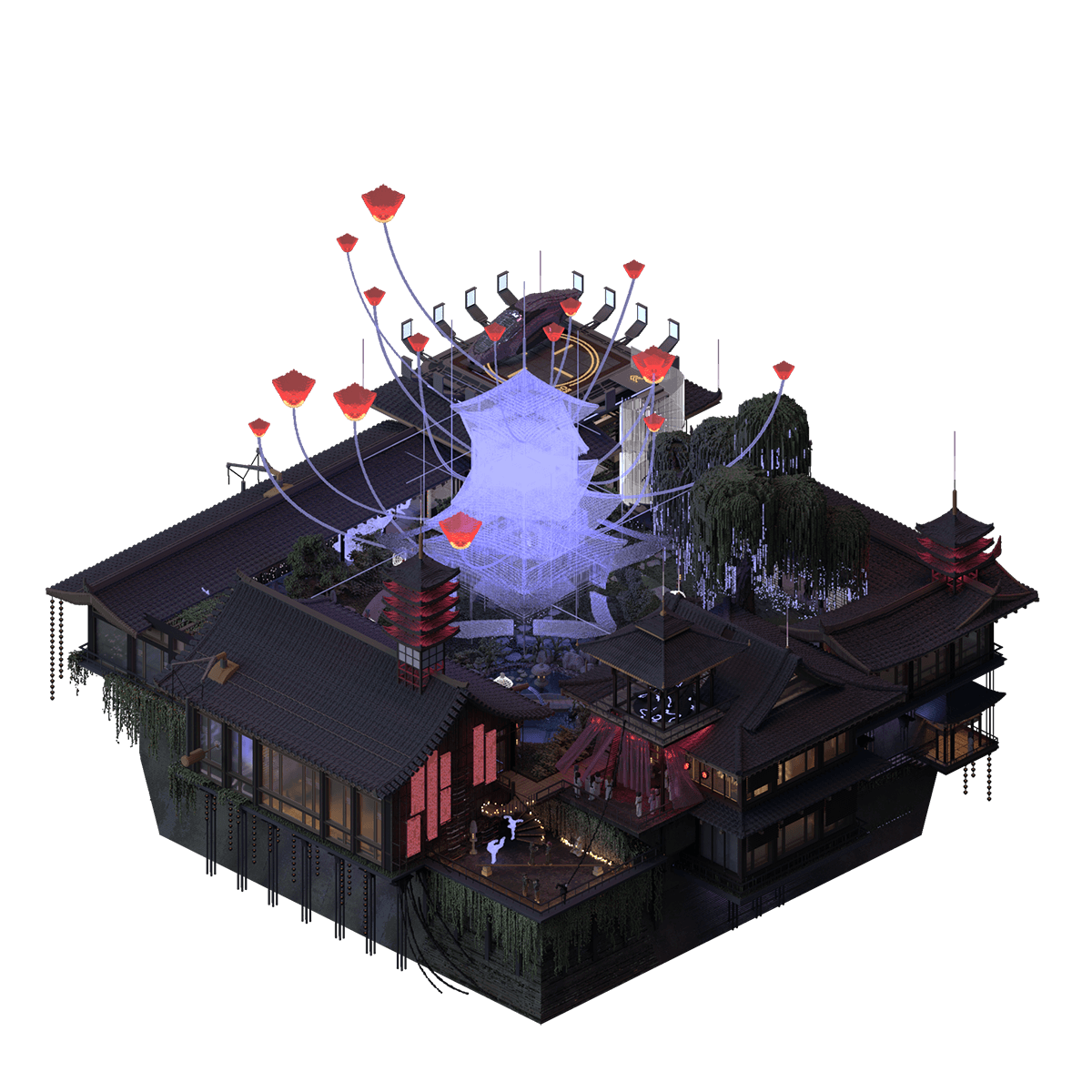 Built around a lush internal courtyard, the Tanaka Villa is inspired by the architecture and decor of traditional Samurai housing. With most of its space devoted to exhibitions and displays of classical Japanese art and culture, the Tanaka Villa has been carefully curated to make all guests feel as though they have stepped back in time. Upon descending from the rooftop, guests are served tea. They are encouraged to sip their drinks as they walk through the colonnades and take in the breathtaking scenery. Throughout much of the Villa, augmented reality holograms replace organic materials and greenery. The most eye-catching of these is the blanket of nonexistent flowers that cover the lawn, constantly sparkling in bloom. Aside from the courtyard, guests can wander the grounds to explore the rooms and surprises dotted around the Villa. The most famous of which is an anti-gravity room that allows visitors to freely float around and view the Villa from different aerial perspectives. The residential quarter, designed solely for one person, consists primarily of a studio space adapted to create spatial paintings. Located above the studio is the lone bedroom of the entire residence and the only private area in the Villa that is so often filled with crowds of guests.