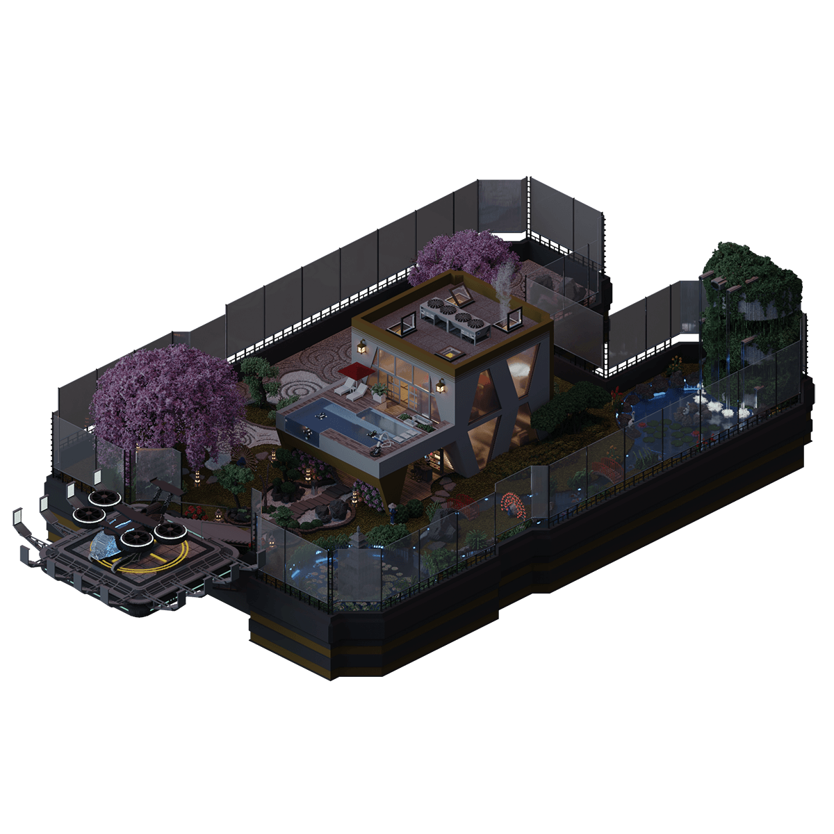 Atop one of the tallest buildings in NeoTokyo, the Peacock Villa is a colorful and decadent manor that is undoubtedly a show stature within the City - even relative to those in Class 1. Intricately decorated zen gardens dotted with vivid pink Sakura trees are dissected by gently flowing streams that spider from a man-made waterfall, making their way to a small pond on the opposite side of the garden. The owners, Osamu and Keiko Hoashi, chose the name of the villa to reflect the vivid colour palette that can be seen from above. On the theme of the garden, an endangered Indian Peacock roams their grounds - no small personal expense for the family and to the envy of their peers within Class 1. Born as the only child to Taro Hoashi, one of the name partners at the prestigious Doko & Hoashi law firm, Osamu and his wife Keiko have followed in his family's footsteps and are two of the most high-profile and successful lawyers in the City. Their house is always found with an array of assistants, chefs, gardeners, and maids strewn throughout its grounds, to maintain the image they and their estate have cultivated.