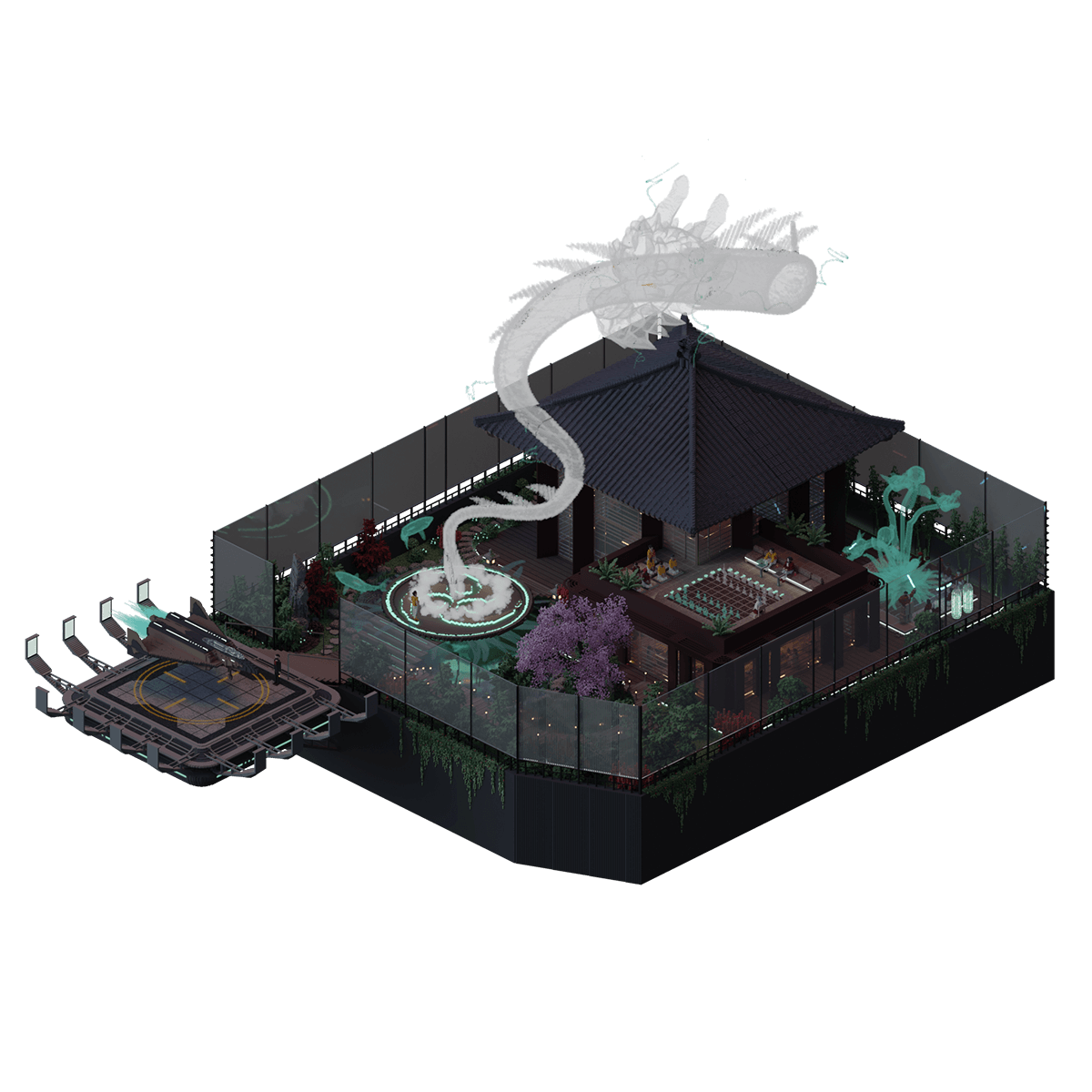 Home to one of the most prominent families in NeoTokyo, the Ichikawa Villa is an unusual sight within the City's skyline. Although the family possesses extreme wealth, evidenced by their living up in the mist at the summit of the City, the family still chooses to live in a very conservative and traditional manner, mirroring the lives of their ancestors. The most prominent building, a rectangular meditation room centered around a centuries-old Japanese Maple Tree, is the oldest and most historic piece of architecture on the family's property. Originally built on the family's farm two centuries ago, the building has since been renovated and relocated to the top of the City. The tree, grown from a sapling over 150 years ago and which has been nurtured by their family for generations, has since become a symbol for their house. Often found playing traditional strategy games when they are not praying or meditating, the family is well known for being reluctant to introduce technology into their lives any more than is strictly necessary. The most noticeable aspect of their property, however, is the colossal smoke dragon that encircles their Villa from above. The dragon, believed to be a symbol of protection and guidance, is something the family often looks to when faced with adversity.