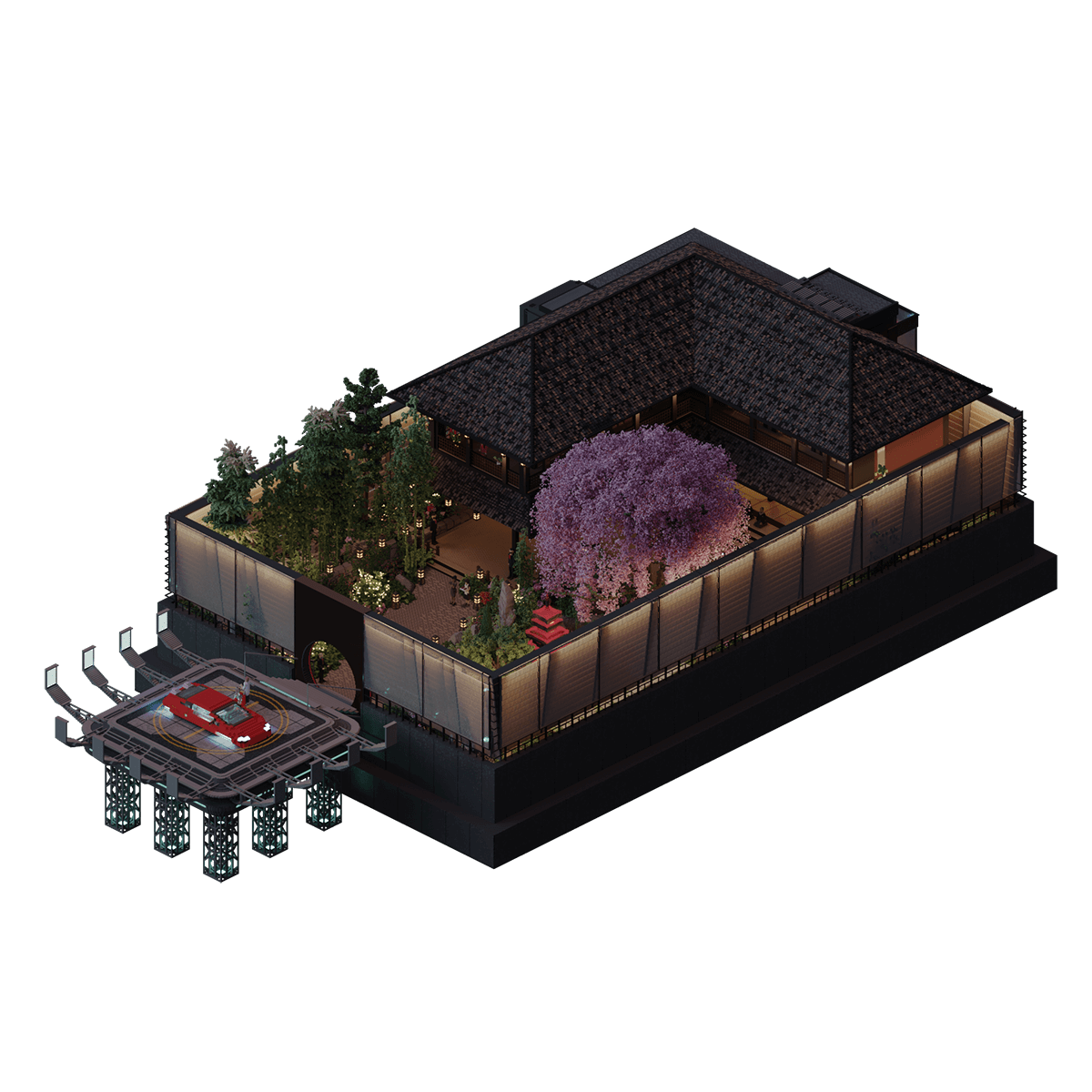 Radiating a sense of tradition that is felt immediately after exiting the landing pad, this large two-story Minka-style house is the Toshima family's villa on the skyline. Flanked on either side by dense bamboo gardens and groves of colorful bushes, the entranceway to the house is engulfed with a soothing natural energy, where small stone pathways crisscross the grounds leading to hidden shrines and pagodas. Standing atop the second-story balcony that faces the entrance, the Toshima matriarch, Keiko, casts a watchful eye over the three generations of her family scattered across her vast grounds. Born into an aristocratic family, she was the sole founder of Toshima Enterprises, one of the most successful real estate development companies in NeoTokyo. She now spends her time proudly watching over the estate and the opportunities she has been able to provide to her family, which will live on for many generations to come. Elsewhere in an outdoor sparring arena, two of the youngest grandchildren are engaged in a kendo duel as their fathers sit on the sidelines coaching them. Located underneath a wise black sakura tree that has seen generations of the Toshima family duel, kendo is a tradition steeped in the family's heritage, evidenced by the samurai armor watching on in the corner.