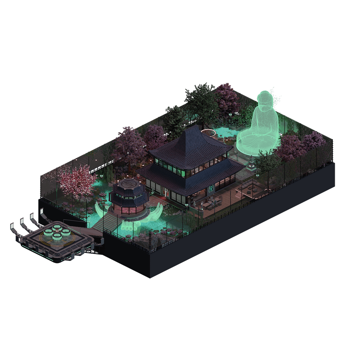 Originally the site of an old Buddhist monastery located within the City, the space has evolved to reflect the environment around it as Tokyo changed to form the dense metropolis that now sits beneath the Villa. Although no longer a monastery and located atop one of the tallest buildings in NeoTokyo, the Kikuchi Villa still pays homage to its religious roots, albeit in a hyper-modernized fashion. Now home to the wealthy Kikuchi family, prominent in real estate development, the monastery has since been renovated into a neo-traditional two-story pagoda. Upon arriving at the Villa, entrants must first walk through a pagoda suspended over a small pond, where holographic lotus leaves appear to encase the structure's base. Clusters of lily pads and lotuses lie along the banks of the pond below, matching the pink projection of the flower at the base of the pagoda that symbolises the family's purity and longevity. To the Villas rear lies a massive hologram of the seated Gautama Buddha, which as a family of practicing Buddhists for many generations, provides a place for the Kukuchi family to pray and meditate in the comfort of their home. Along with being a place of prayer, the Buddha is also a showing of the family's faith and is something they are proud to showcase to all in NeoTokyo.