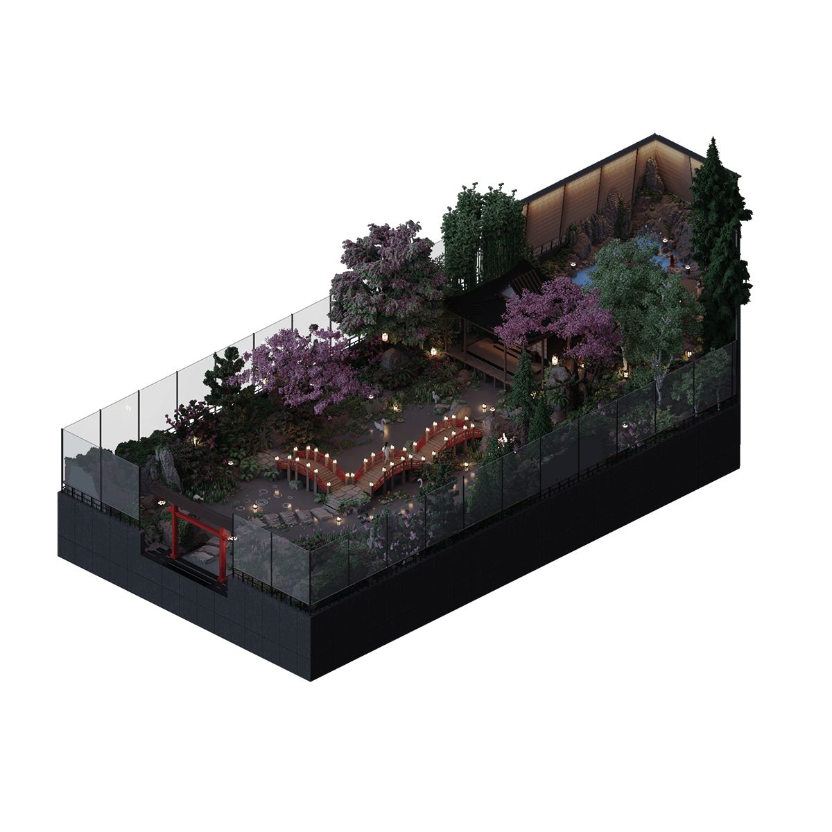 Seemingly modest by Class 1 standards, the Sugi Grove is a sanctuary within the clouds. Popular for weekend getaways amongst the wealthy youth, the space was originally built as a shared venture between the City's elite as a place for them to relax and detox from the chaos of NeoTokyo. Upon descending from the landing pad, guests make their way along a stepping-stone pathway built into a river, before coming to an intersection of Guzei Bridges. There they can either continue onwards towards the central cabin or can turn to sit beneath a blooming Sakura Tree and enjoy the sounds of nature around them. The river, which weaves through the entirety of the property, headwaters from a hot spring tucked in the southernmost corner. Sheltered within a rocky pool it is a popular swimming spot, particularly during the City's winter months. Obscured from view by the thickets of foliage, the cabin in the center of the property is seemingly hidden from the world around it. A small single-story building with only a single room, the space is primarily used as a meeting place, as the elite of NeoTokyo rarely sacrifice the comfort of their homes to sleep here.