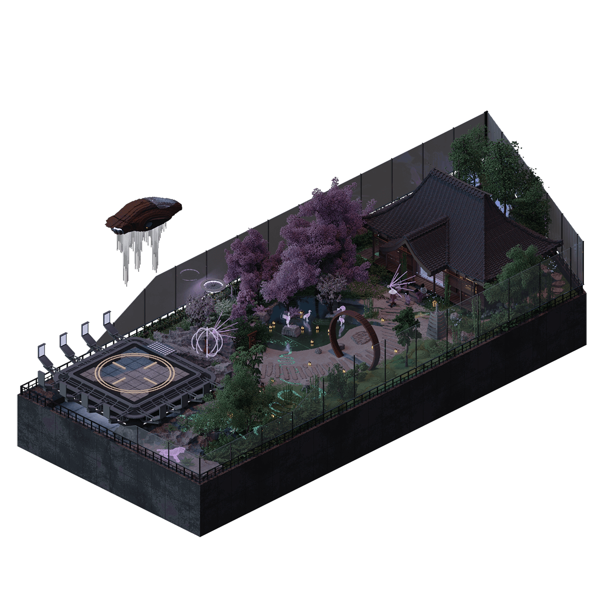 Villa 74, commonly known amongst the City's elite as the Wildlife Oasis, is an animal sanctuary among the clouds and a popular holiday destination for the wealthy. Owned by the wealthy Toshima family, who built many of the original villas within NeoTokyo, the space is now available to be rented by any fortunate enough to afford it. Upon landing, an update is applied to the guest's neural chips rendering the holographic animals that roam the grounds docile and reactive to the guests and changing their form to appear as real animals of flesh and bone. Guests then make their way along a winding stream and past a pond encircled by a sedge of cranes before finding themselves at the entrance of the traditional Japanese summer house. Complete with a large staff of chefs, maids, and gardeners, guests can relax and enjoy the hot springs to the rear of the house and make the most of their holiday at the top of the City. However, the most appealing and famous aspect of the Villa to prospective guests is the largest animal and unofficial mascot of the property, the Bengal Tiger. After years of poaching, Villa 74 is one of the only places humans can still see this breed of tiger, and as such, the property is often booked out months in advance.