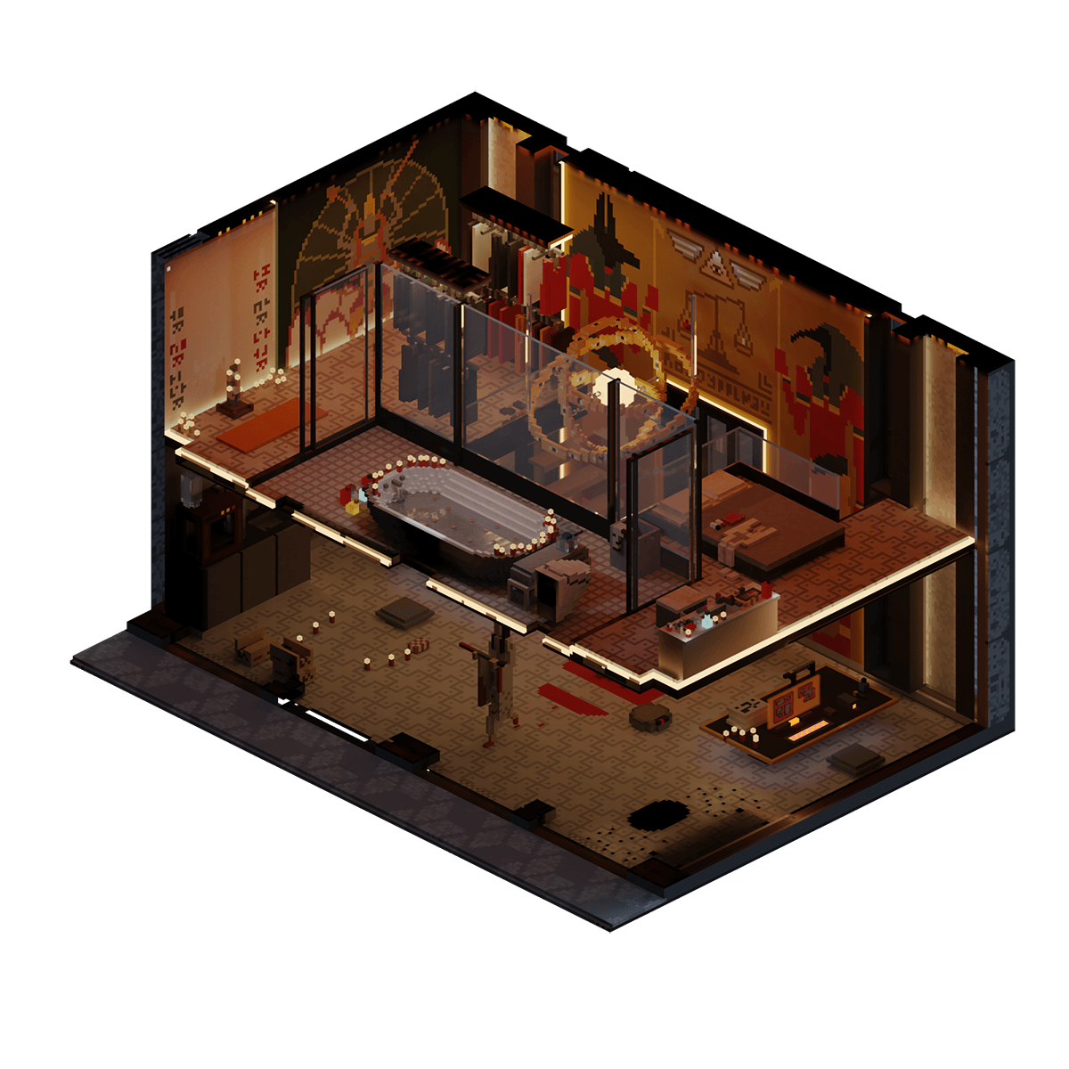 The flat of a high-ranking member of society who, unable to deal with the stress and expectations of the modern era, has snapped and conducts sacrificial killings in her apartment. Initially commencing her sacrificial after becoming disillusioned with life in NeoTokyo, she has started to ramp up the frequency of her acts, knowing she is protected by her status and influence within the elite of the City.