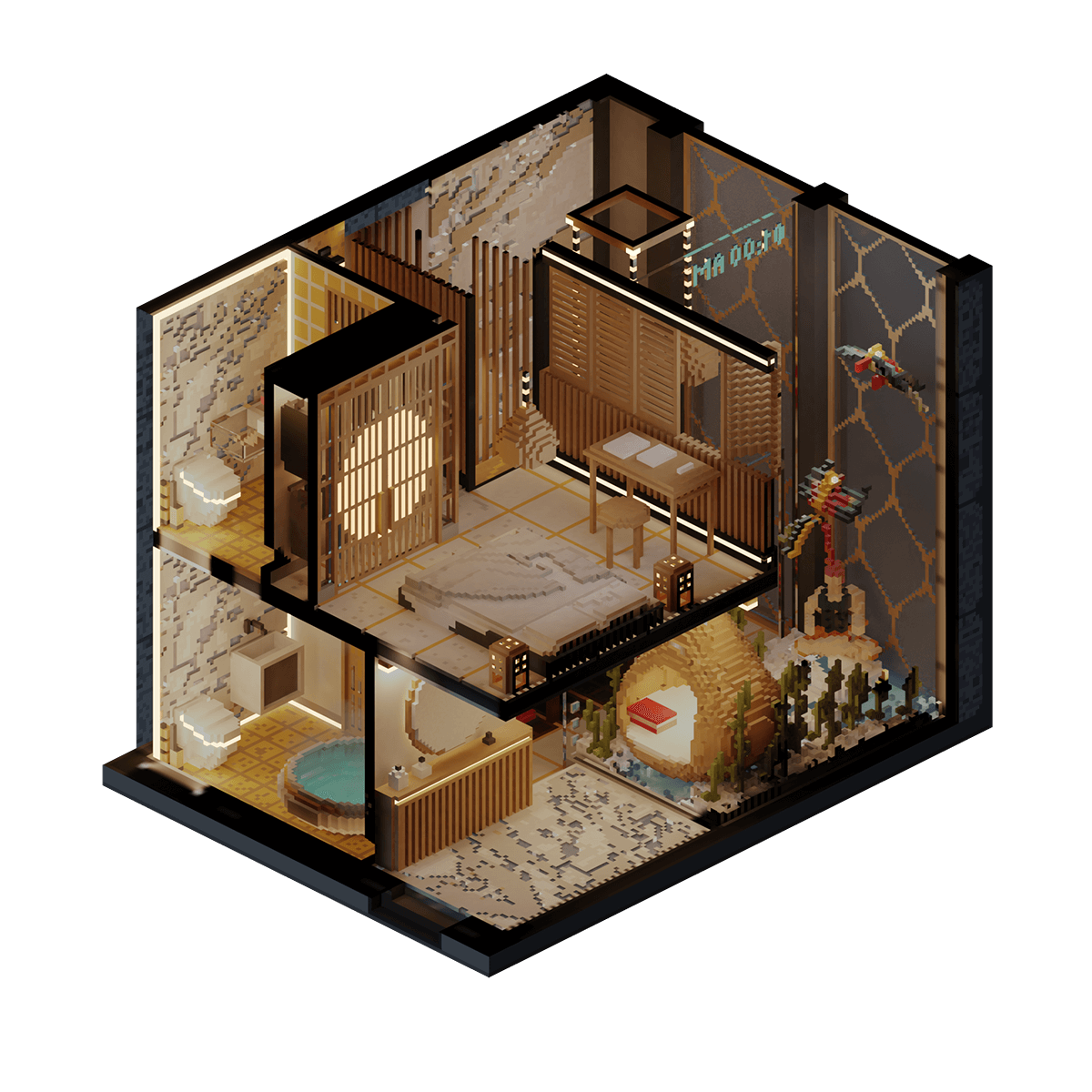 Adorned with nest chairs hanging over the calm waters of an indoor stream, this apartment is home to a variety of tranquil spots for the couple that lives here to meditate - or to relax in the company of their exotic birds that also call the space home.