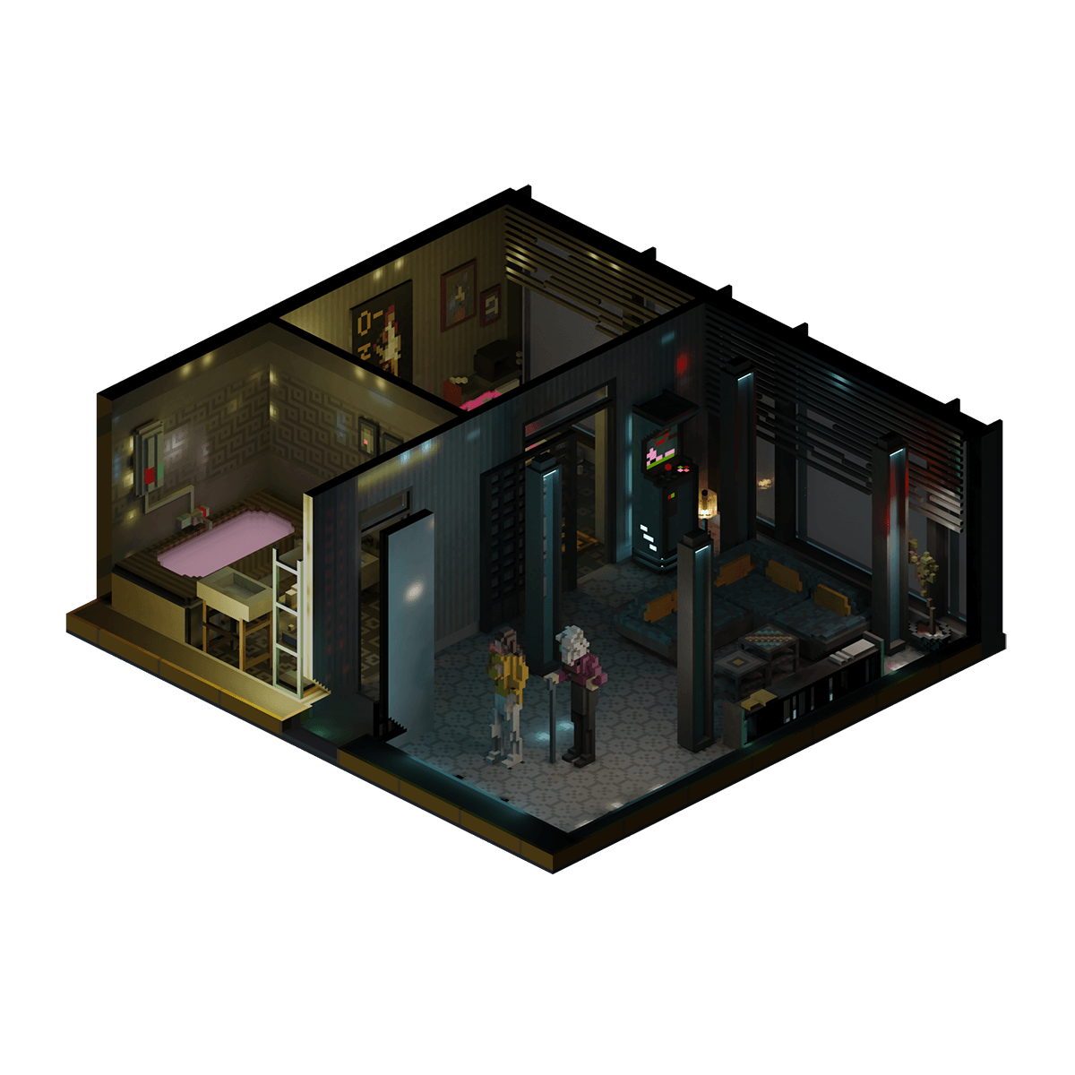 The apartment of an aging musician, his walls adorned with old news clippings and framed record certifications, as he recounts stories from his youth as a rockstar to his grandson.