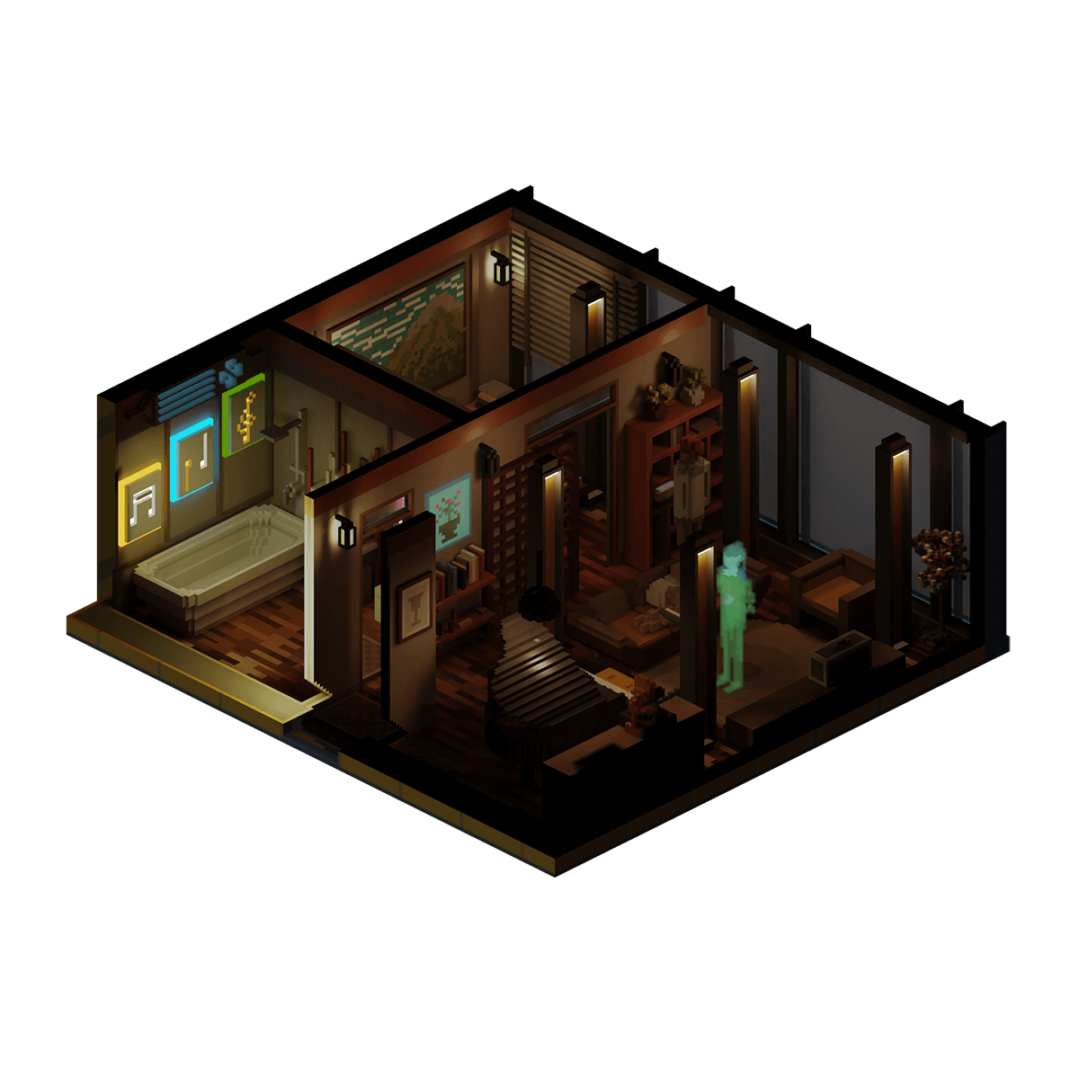 The orderly apartment of a classical jazz pianist where he is performing his newest composition to his girlfriend and a projection of his conductor, eagerly awaiting to hear their feedback.