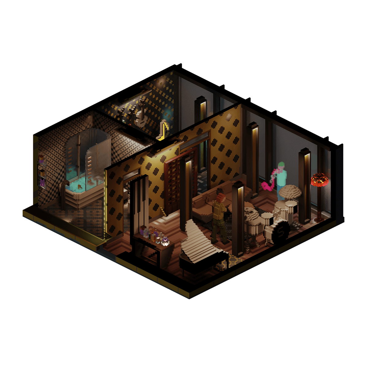 The apartment of a jazz musician currently having a jam session with a hologram of one of his band members. With their upcoming debut at the Tokyo Lounge later in the week, they are preparing the finishing touches for their set.