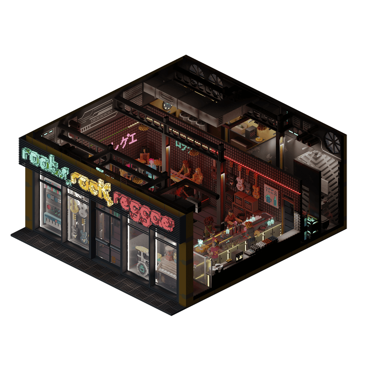 Roots, Rock and Reggae, a music store and bar which acts as a melting pot for those in NeoTokyo's music scene, where a wide range of crowds walk through their doors each evening, eagerly awaiting which sonic experience is in store for them that night.