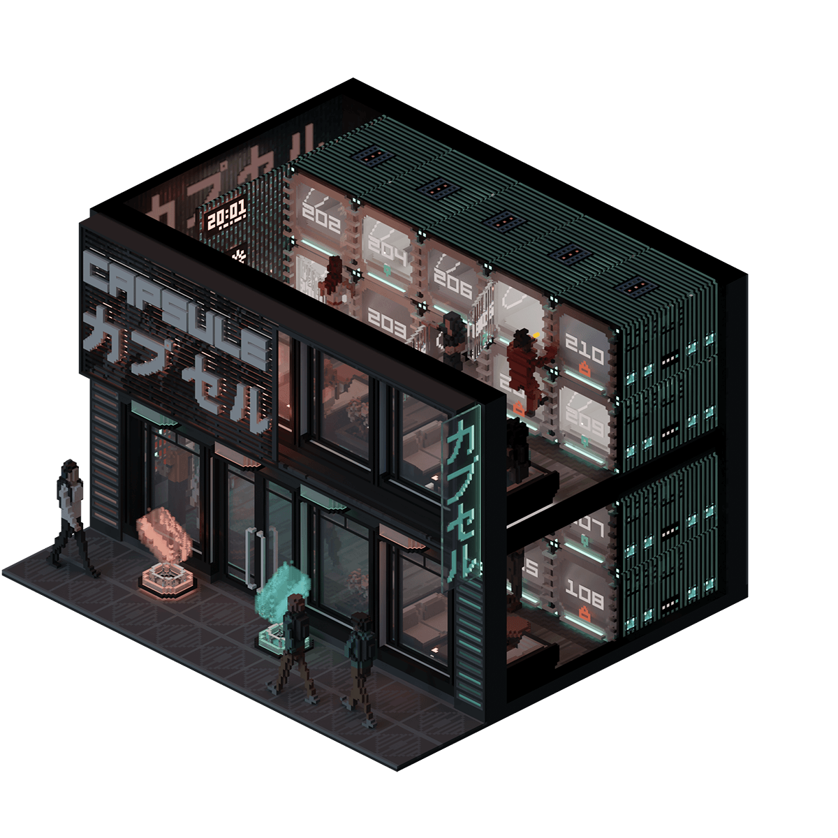 The Pod, a capsule hotel located in the lively late-night district of downtown NeoTokyo, provides a space for those who have had too much to drink and a place to lay their head when they can't get home.