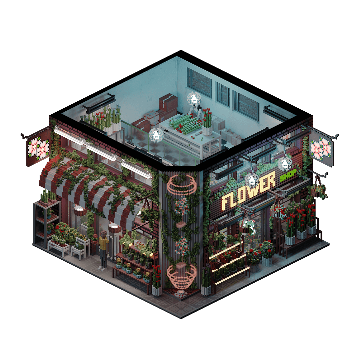 Flowoo, NeoTokyo's resident flower shop provides a taste of life and color to contrast the towering concrete metropolis around it, which makes it a popular and well-loved destination for its customers.