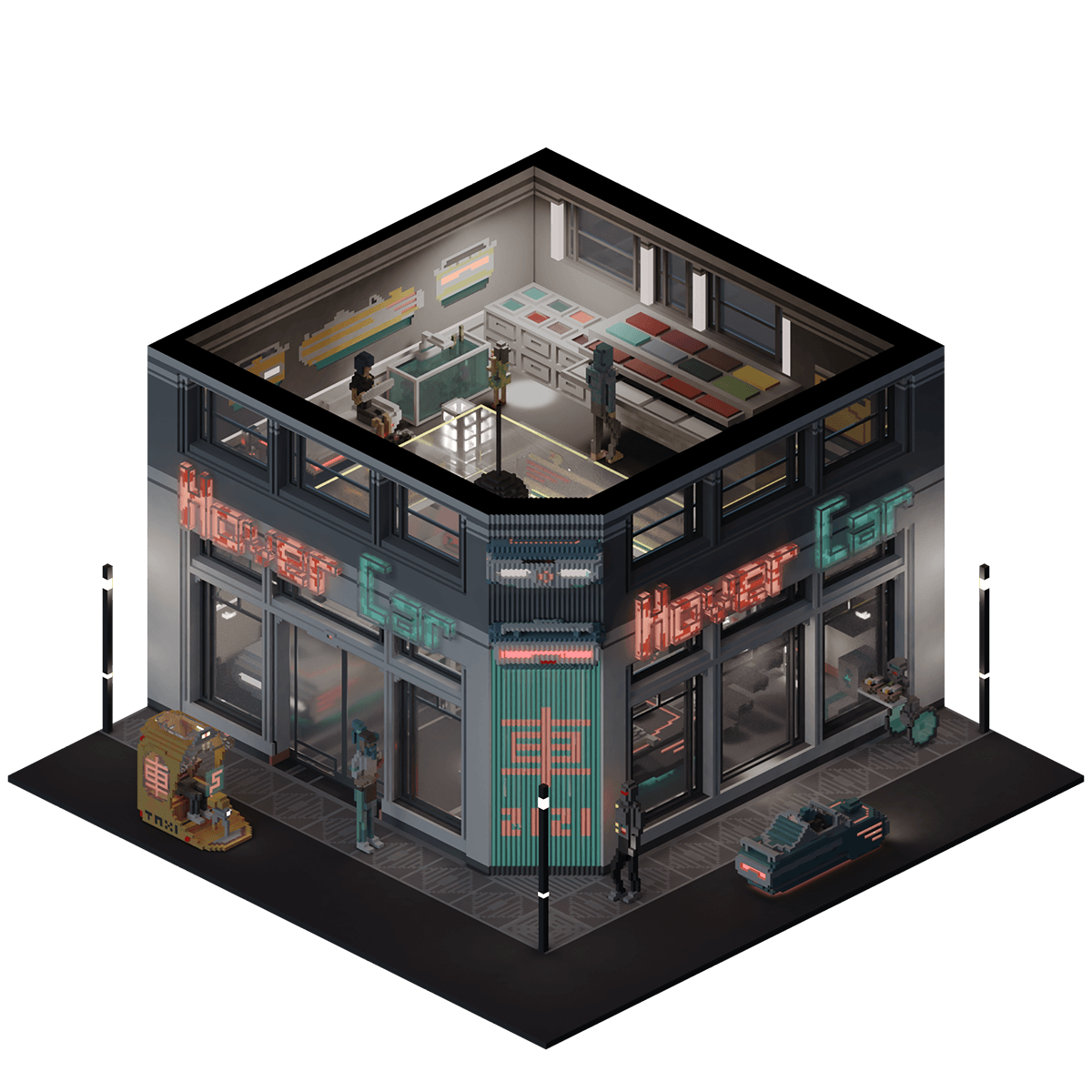 A hover car salesroom, where customers can come to preview the latest range of automotive models and customize them to their liking with a wide range of modifications and accessories.