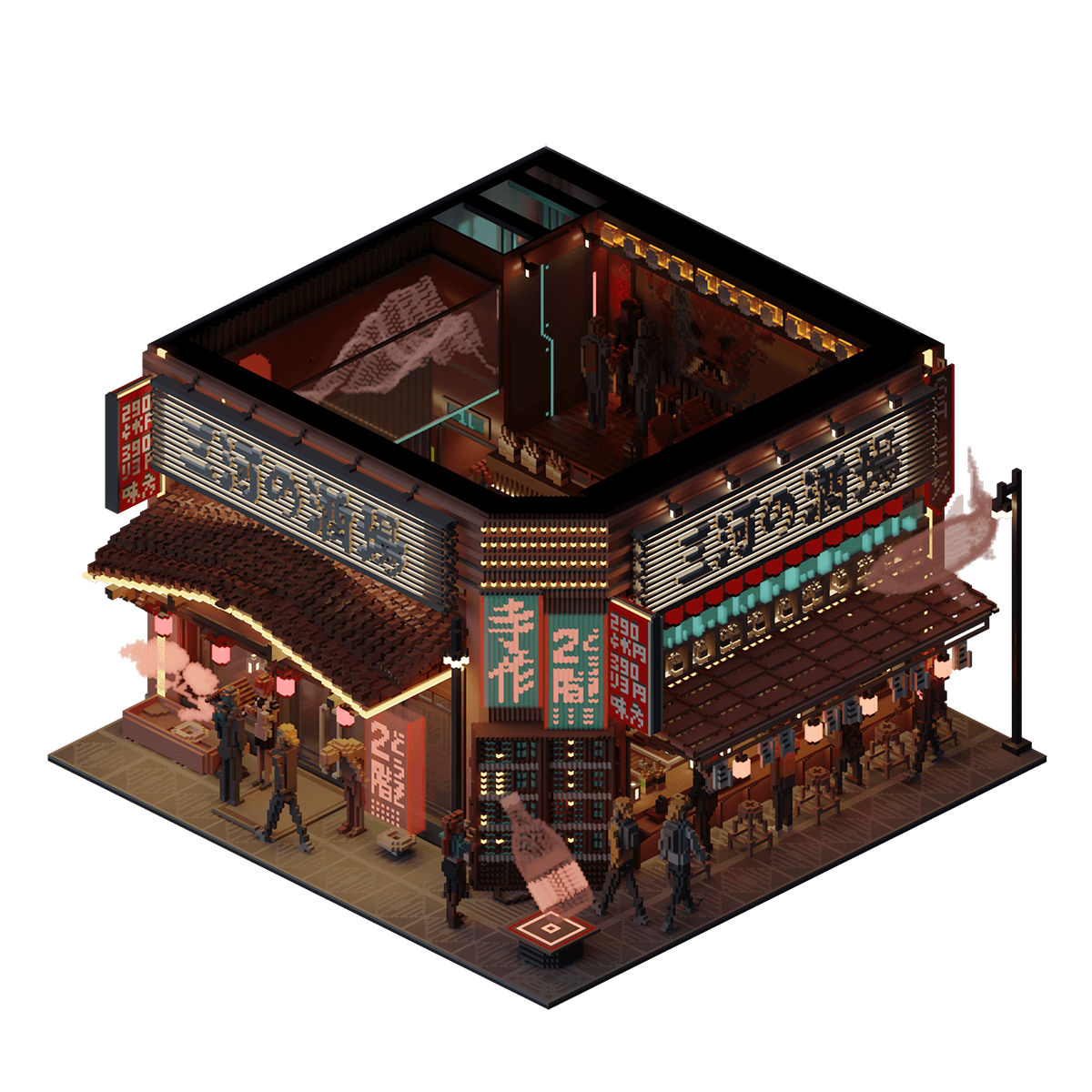 An upmarket izakaya, a bustling nightlife location where customers can come to drink sake until the sun comes up, and enjoy being surrounded by the exquisite neo-traditional architecture that encases them.