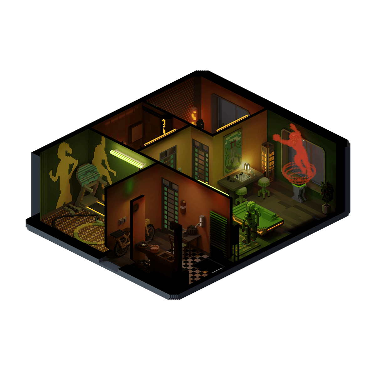 The apartment of a professional sportswoman who plays as a goalkeeper for one of NeoTokyo's top football teams, with many of her rooms filled with exercise equipment to ensure that she is always in top shape for her games.