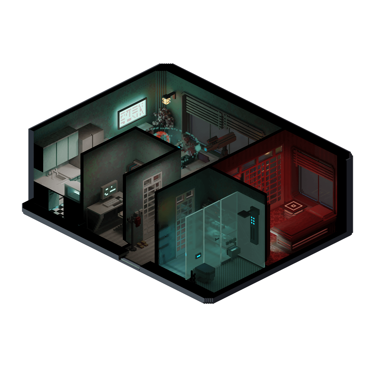 The brightly colored apartment of an astronomy student who is currently analyzing and documenting a holographic projection of a moon he has been investigating, the final part of his thesis.