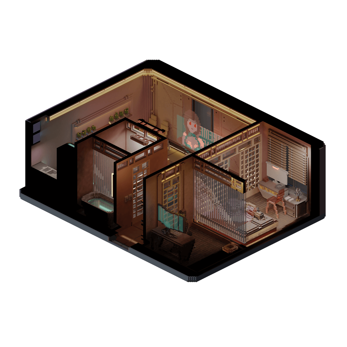 The mellow-toned all-girl sharehouse of a group of students as part of their scholarship at The University College of NeoTokyo, one of the most prestigious tertiary institutions in the City.
