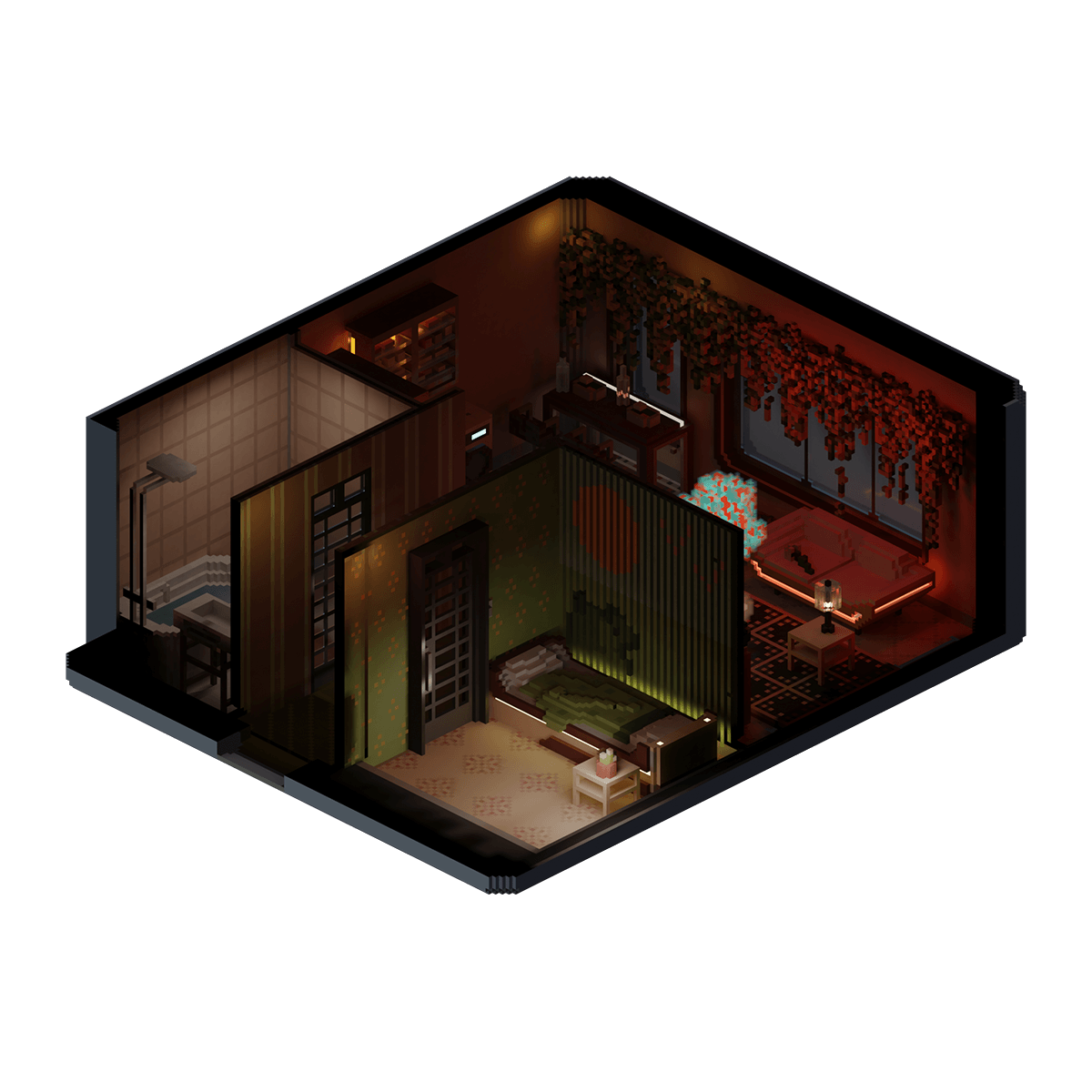 A couple's vibrant and contrasting one-bedroom apartment where bands of hanging plants adorn the walls, bringing another layer of color and a splash of life to the already lively room.