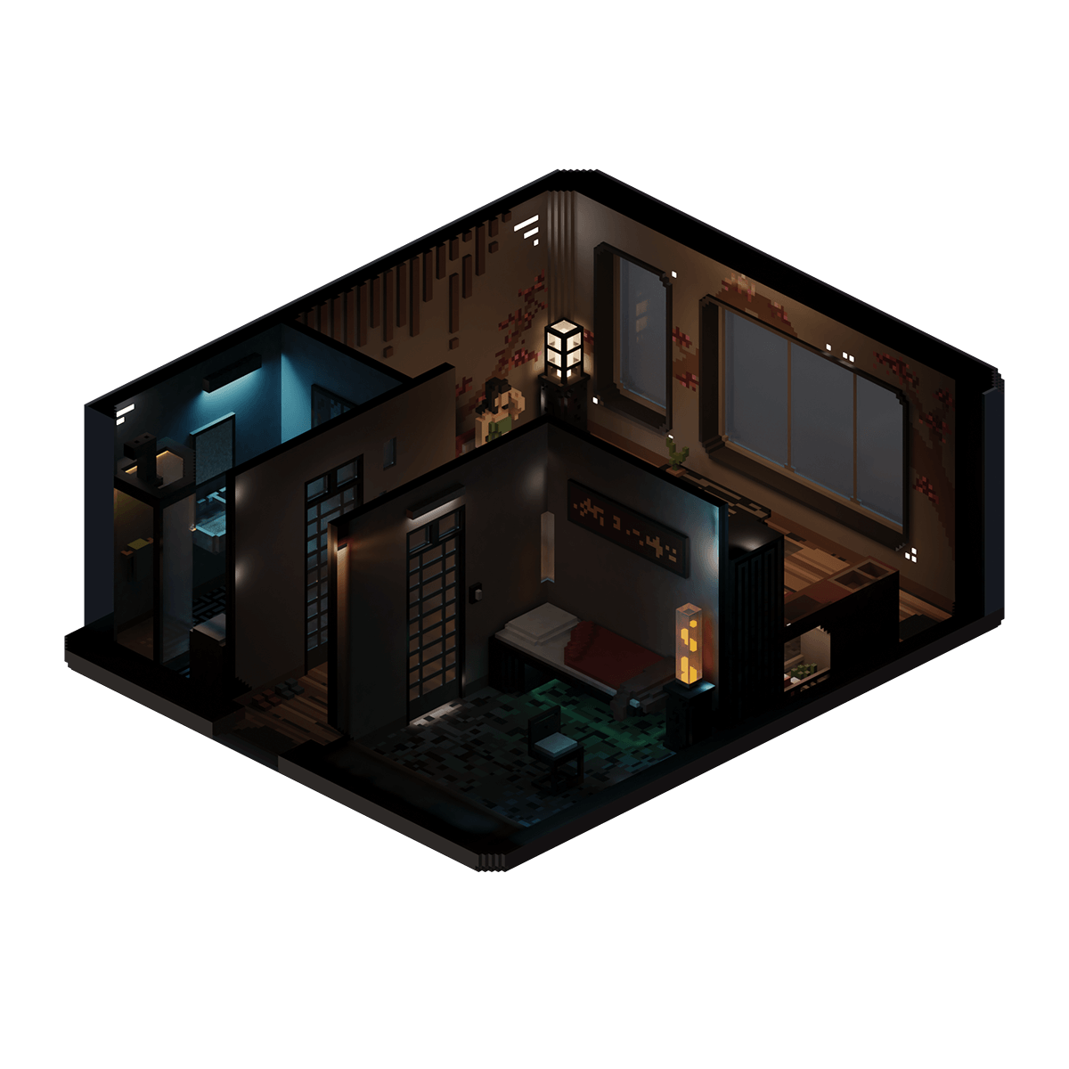 A young man's moodily lit and modest apartment, where he is currently hosting some company in his living room with the only pop of color coming from cherry blossoms painted on the walls.