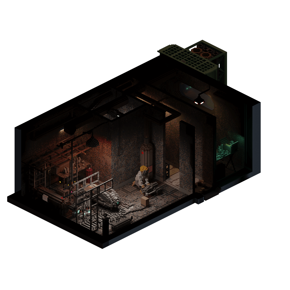 A dilapidated industrial apartment in bayside NeoTokyo's former manufacturing district, where scaffolding lines many of the walls of a man's apartment, some of which function as a workbench, where he is currently welding a piece for the flying motorcycle he is building.