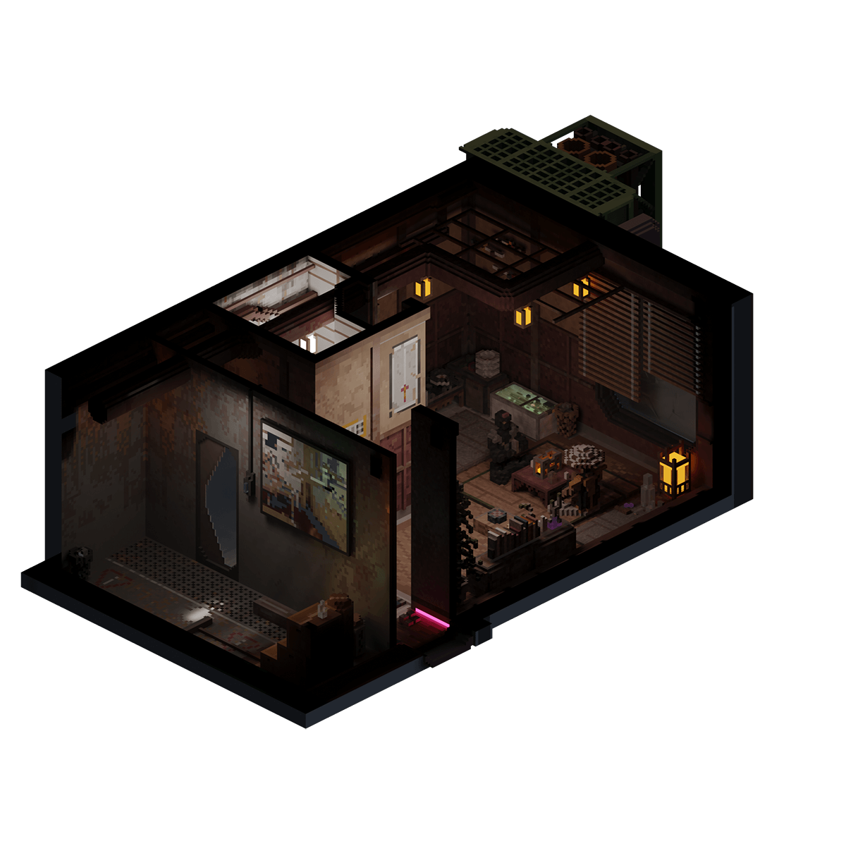 The traditionally decorated apartment of two manga-obsessed cosplayers, who are currently in costume as a ronin and ninja respectively, as they double-check their outfits in preparation for the NeoTokyo Anime Expo.