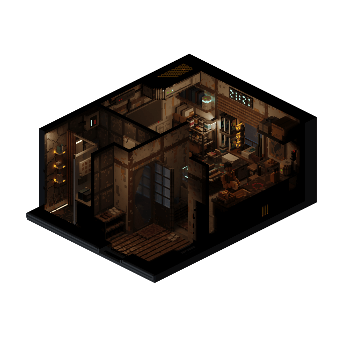 A chaotically organized single-bedroom apartment of a middle-aged man where boxes filled with furniture, records, and artwork litter the floor and stick out in every direction as the man adjusts to life after moving out following his divorce.