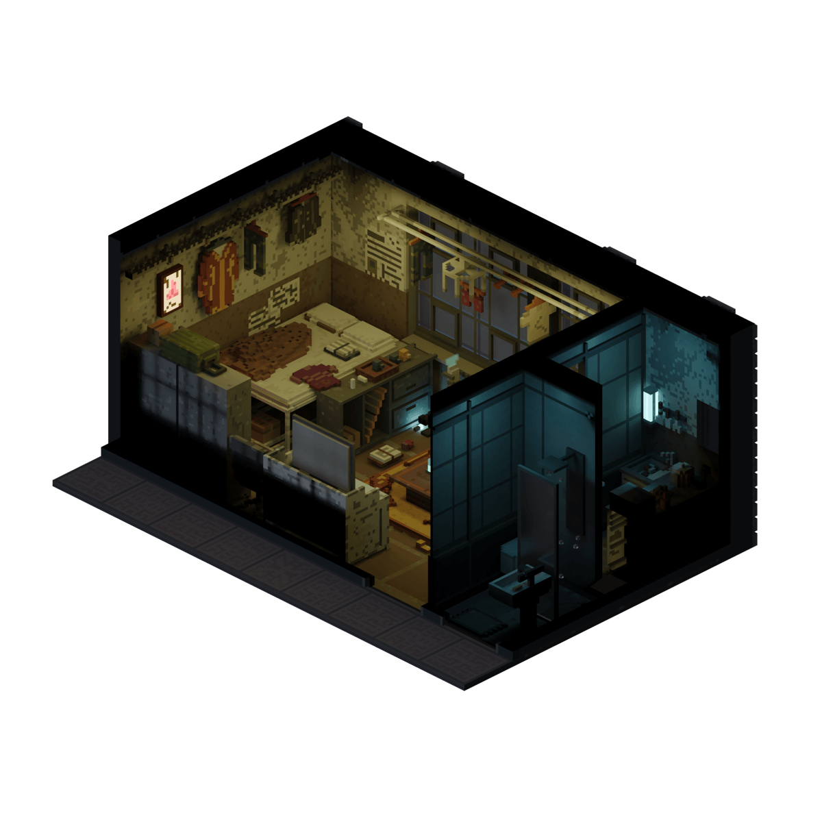 The studio apartment of a young couple, their first step, and a stopgap property for the newlyweds as they take time to save and work their way up through NeoTokyo.