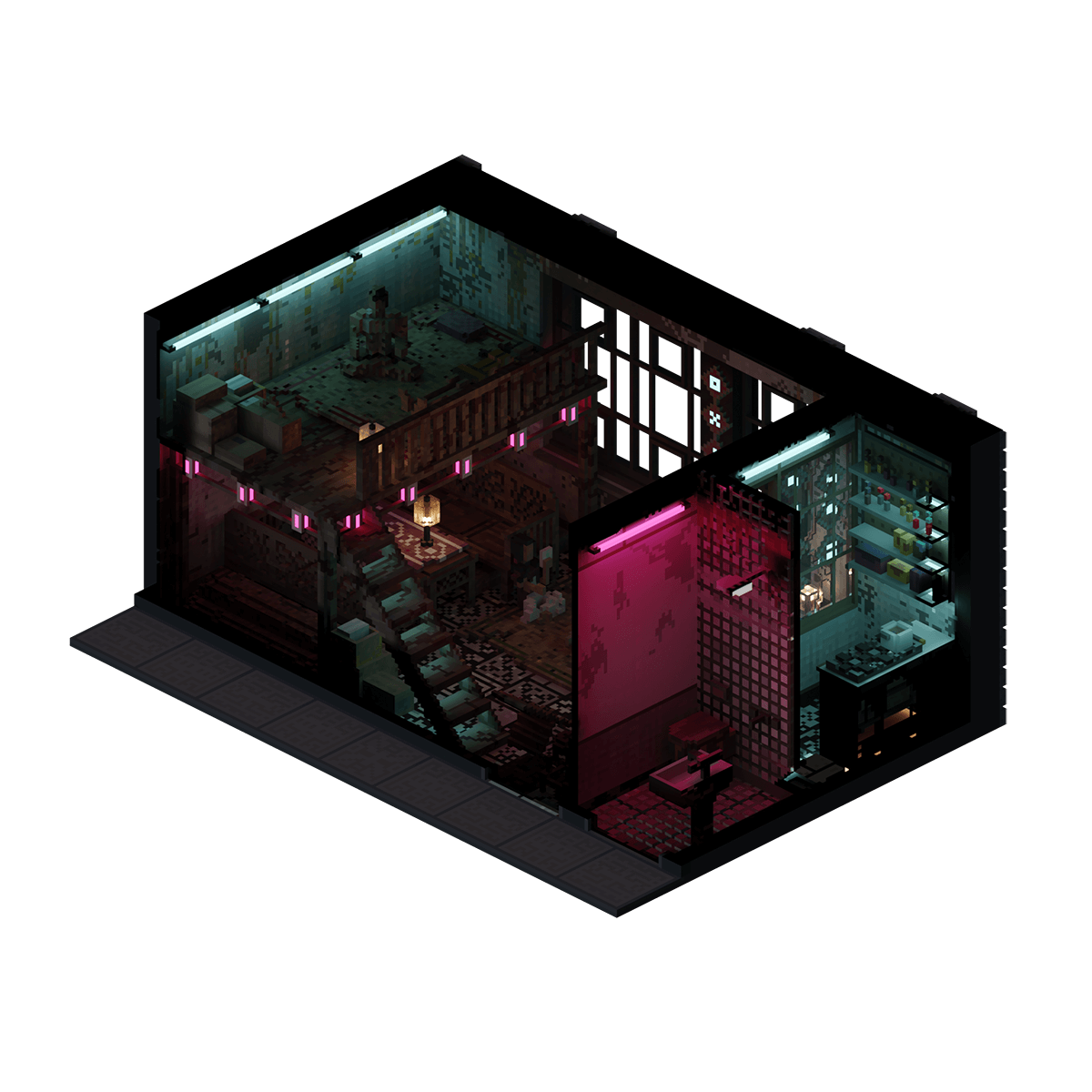 A Vietnamese family's house with walls adorned with a variety of neon lights and patterns that illuminates the space, the front of which also operates as a restaurant during the day.
