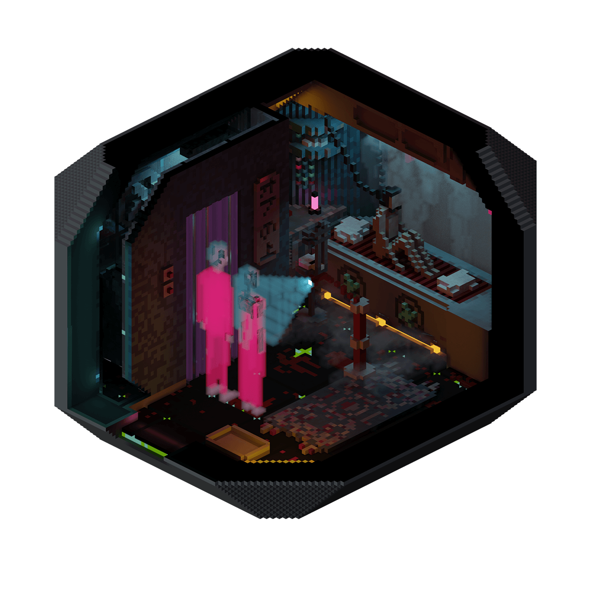 This small capsule apartment is home to a bionically augmented man who has installed a small workshop that allows him to easily modify his appearance and capabilities.