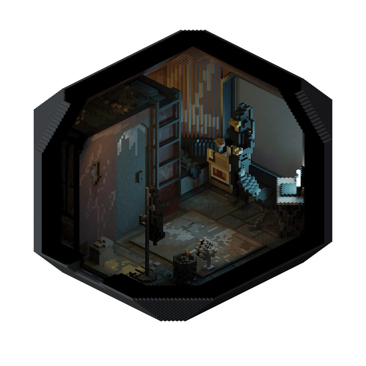 A small and dimly lit capsule apartment, which is of little significance to its owner, as he spends most of his time uploaded into the metaverse in his virtual reality headset.
