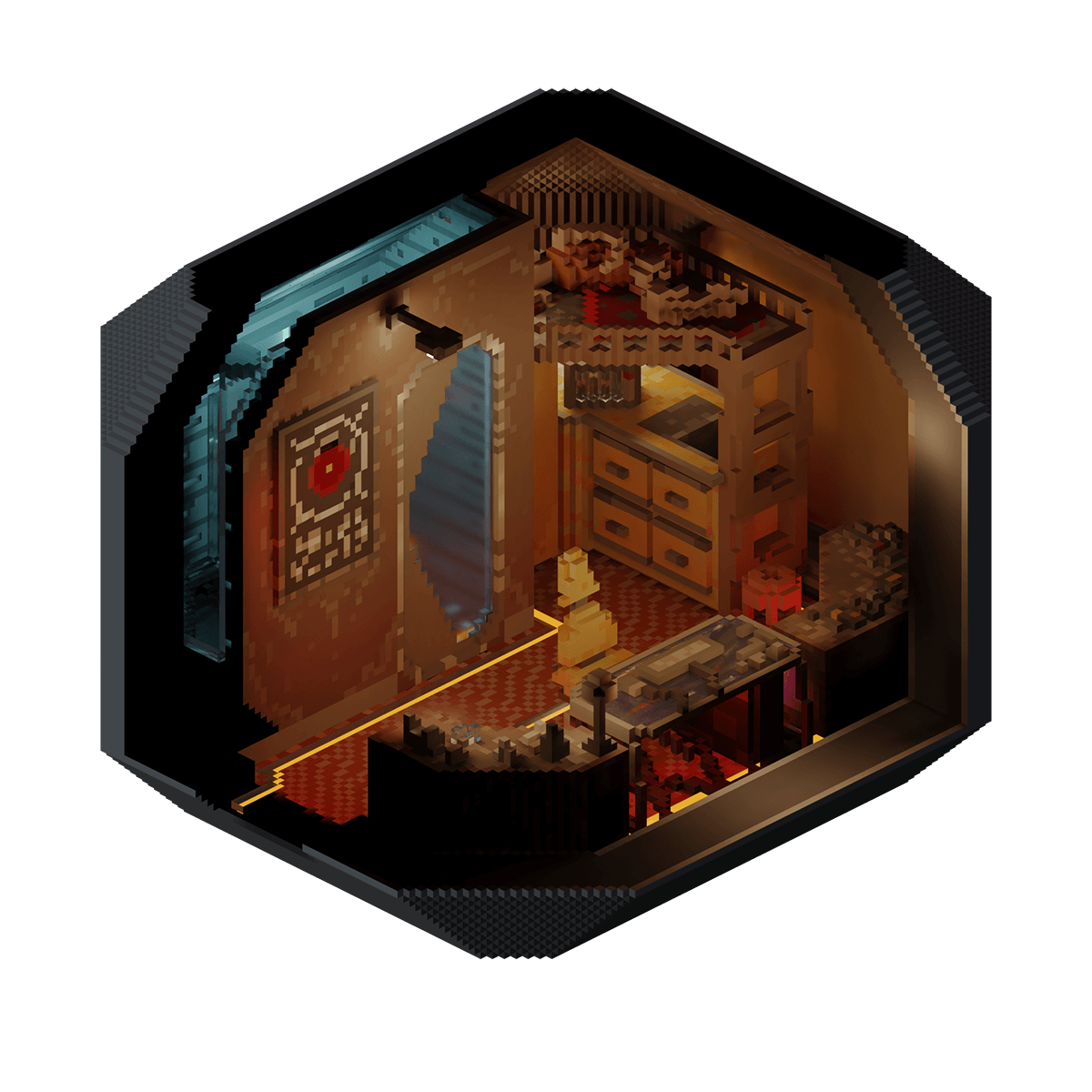 The capsule apartment of a disgraced programmer turned notorious hacker, who comfortably makes his money by selling his services to the highest bidder, behind the safety and anonymity of his wall of monitors.