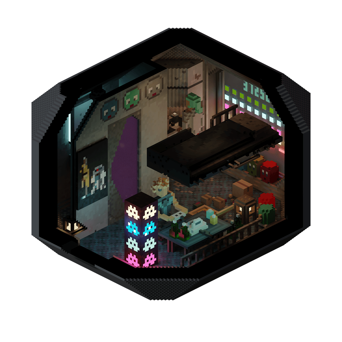 A capsule apartment home to a retro game and film fanatic, where various prints and collectibles from a wide range of genres of pop culture and video games line his walls and shelves.