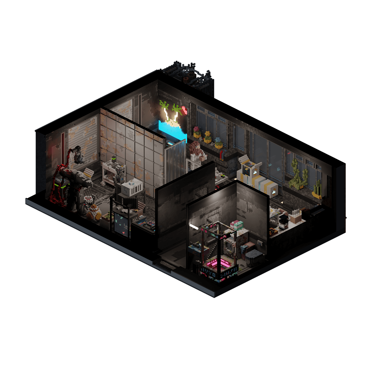 The laboratory and workshop of a scientist strewn with the various tools and pieces of machinery used to create his magnum opus - a robotic exoskeleton that is nearing completion.