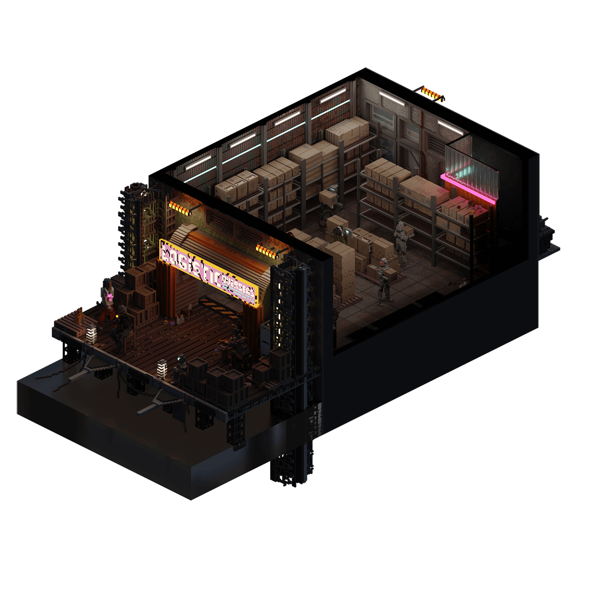A warehouse and logistics office for Geosis International, one of NeoTokyo's foremost trade and shipping companies, which is responsible for a sizable portion of the City's imports, and as such, is constantly filled with crates ready to ship.