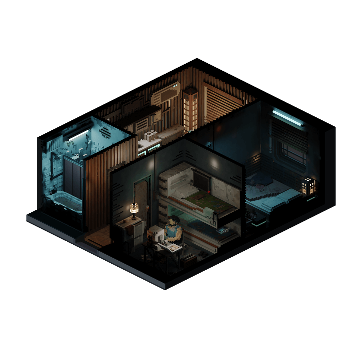 The apartment of a family living paycheck-to-paycheck, having saved up just enough to celebrate the birthday of one of their children in their living room. The oldest son stays in his room practicing his code to get a job and support his family.