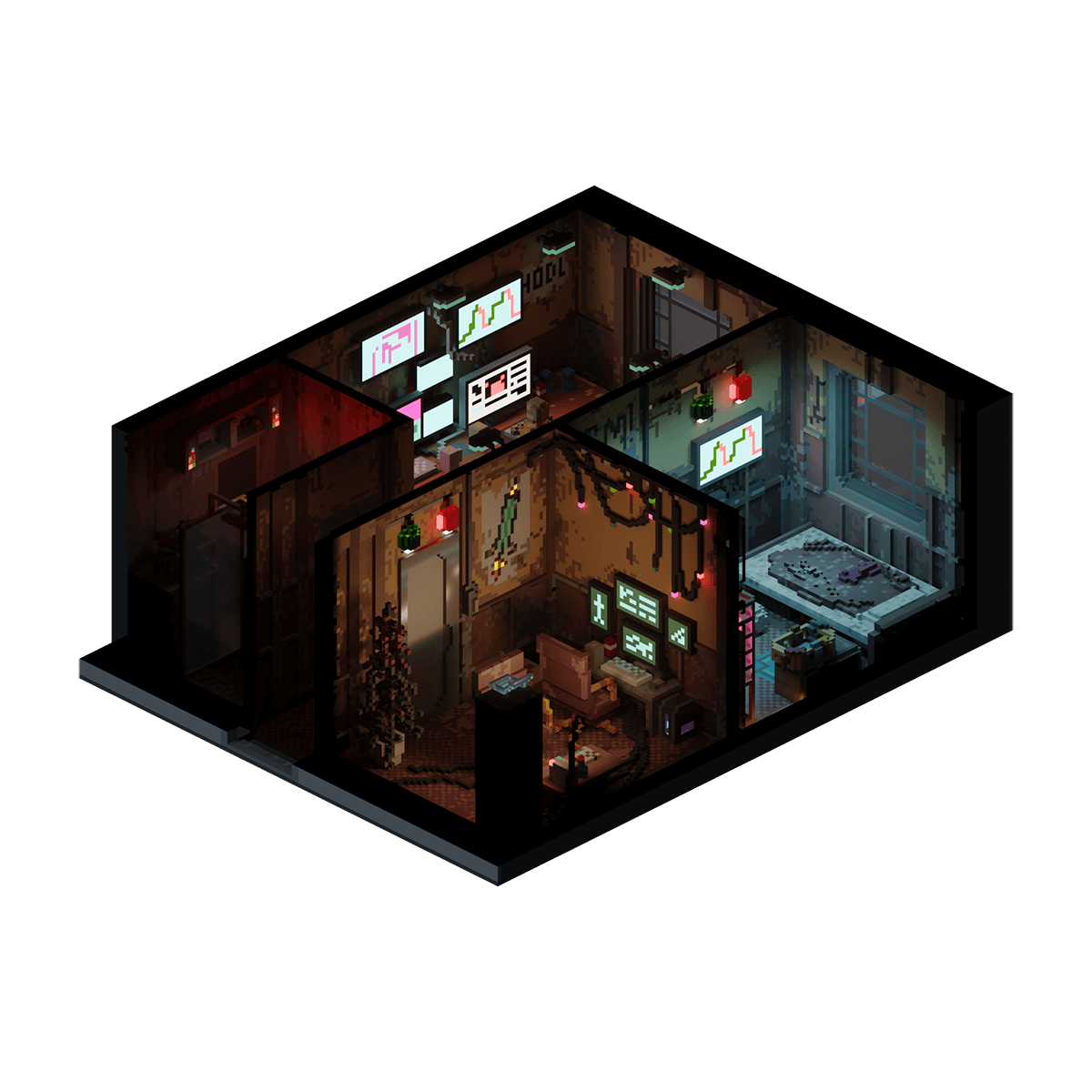 The self-proclaimed "Up Only Apartment" is home to a crypto hodler who has been in purgatory after foolishly buying the picotop years ago. He convinces his friends and family that he will "invest" himself up the ranks of NeoTokyo.