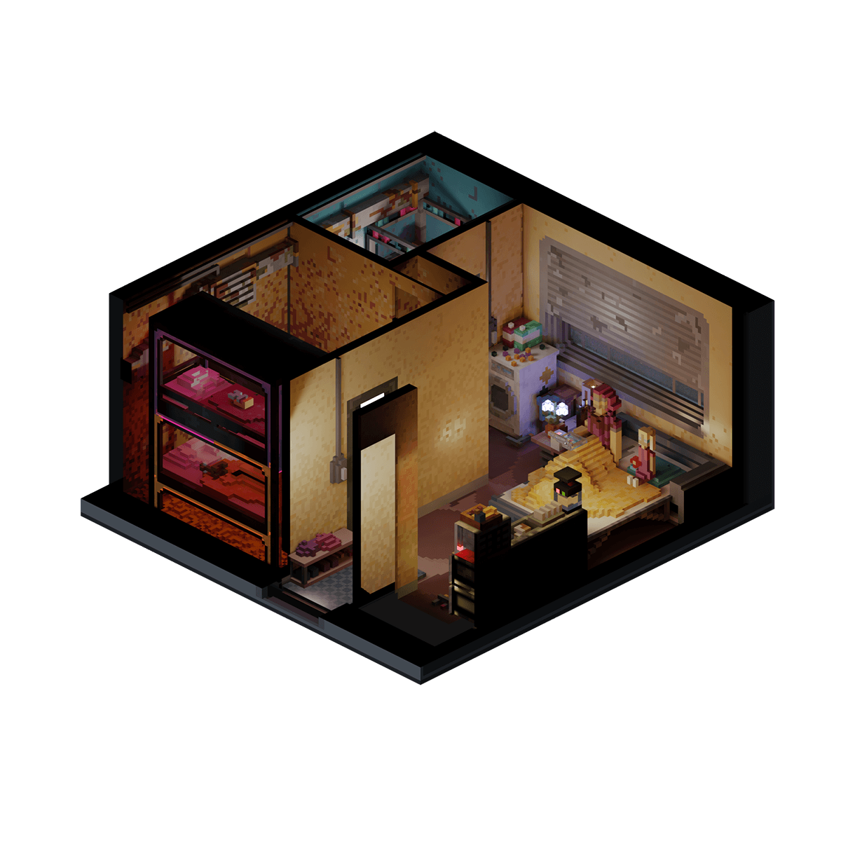 The cluttered one-and-a-half bedroom apartment of a family of five, where the mother spends time watching television with her children, surrounded by walls of family portraits and floors littered with toys.