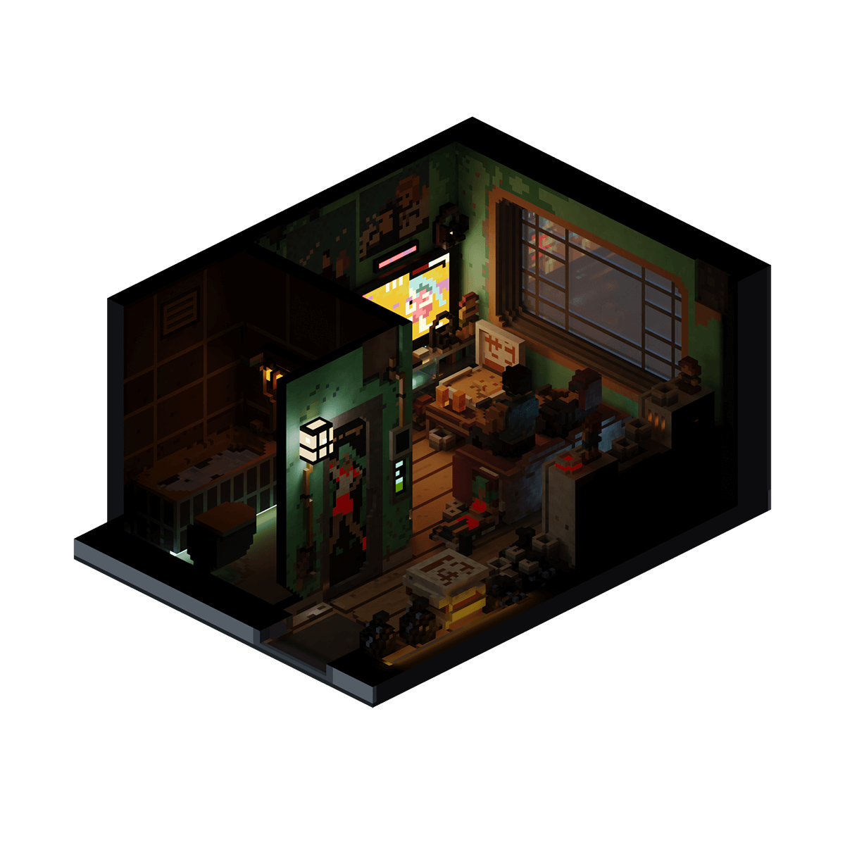 The small studio apartment of a self-professed otaku who is currently hosting a video game night in his living room, surrounded by walls decorated with figurines and posters from various animes and manga.
