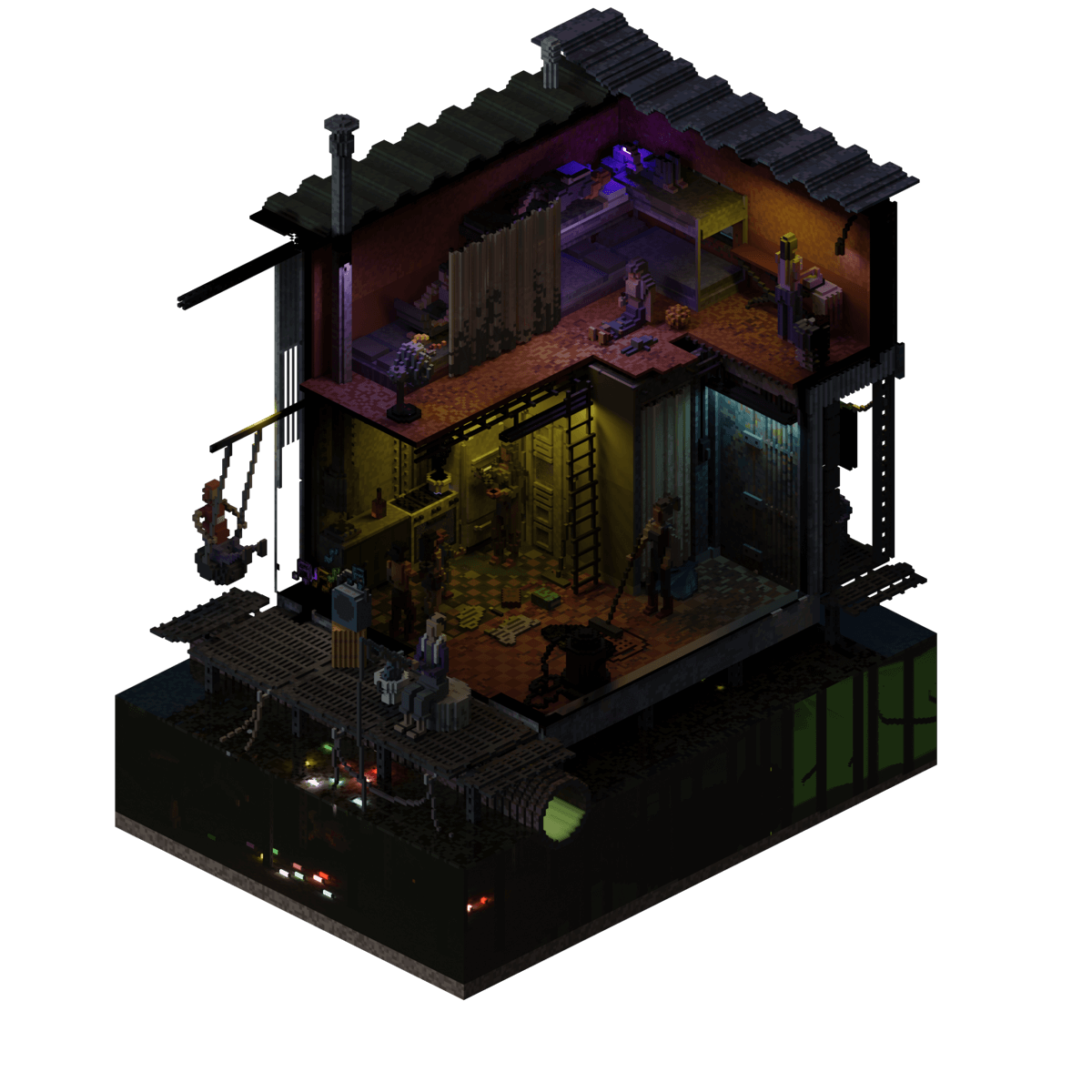 A fisherman's pile dwelling on the Edogawa Canals built above a cluster of colorful lights; his attempt to lure in more fish to where he casts his line while his son watches on from a swing.