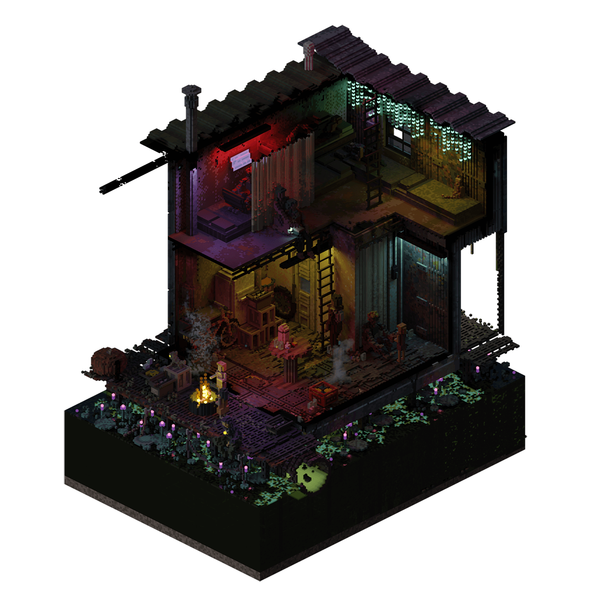 This swamperpunk stilt house, a neotraditional pile dwelling engulfed in a thick layer of moss and greenery, formed after spending years in the lowest reaches of the NeoTokyo and battling the constant spray of the sea.