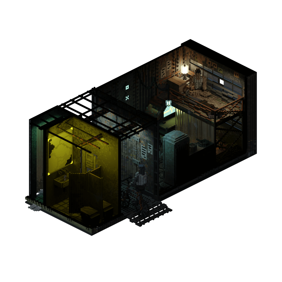 The small and decrepit hovel of a commercial fisherman who, after a long shift of selling his wares at the NeoTokyo fish markets, is sitting in his loft bed meditating to unwind.